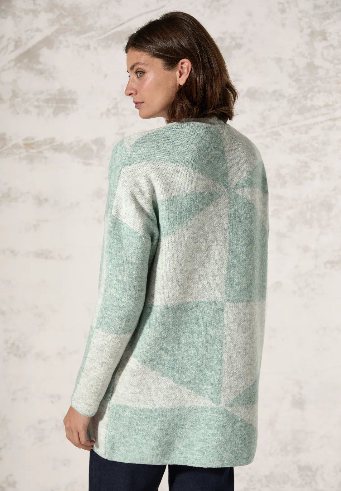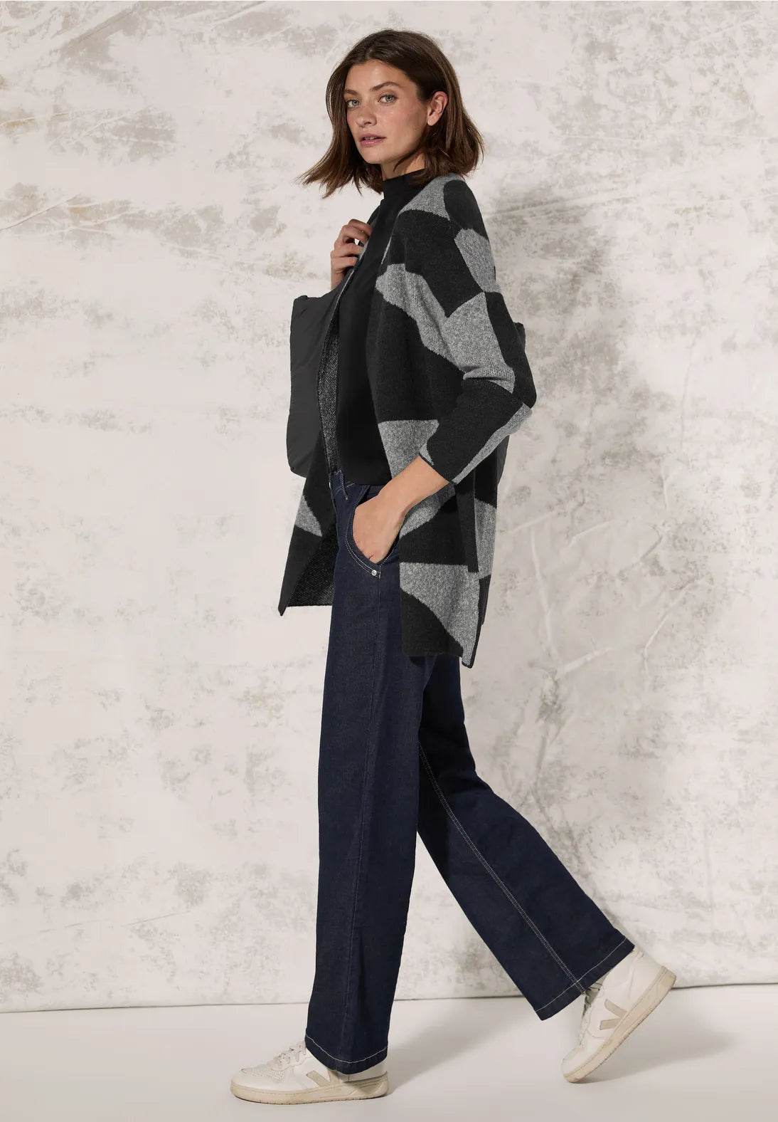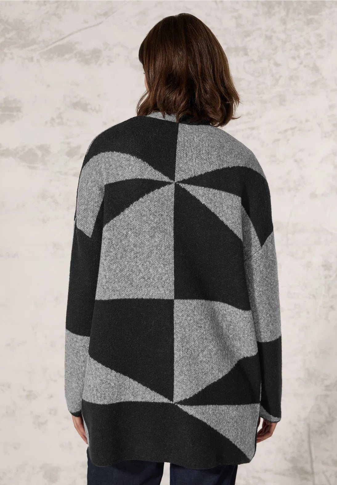 un toque moderno con su estampado gráfico. El cárdigan largo
