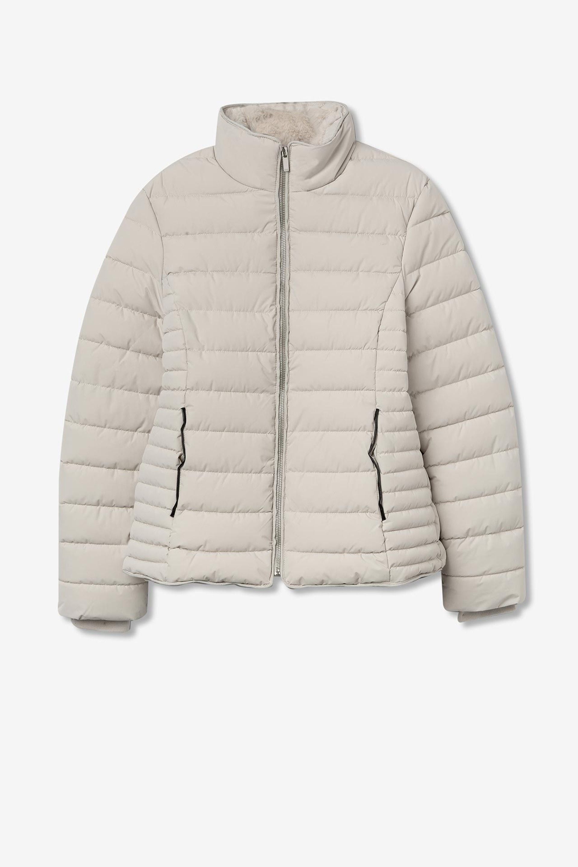 Abrigo de cuello alto y manga larga. Bolsillos y cierre frontal de