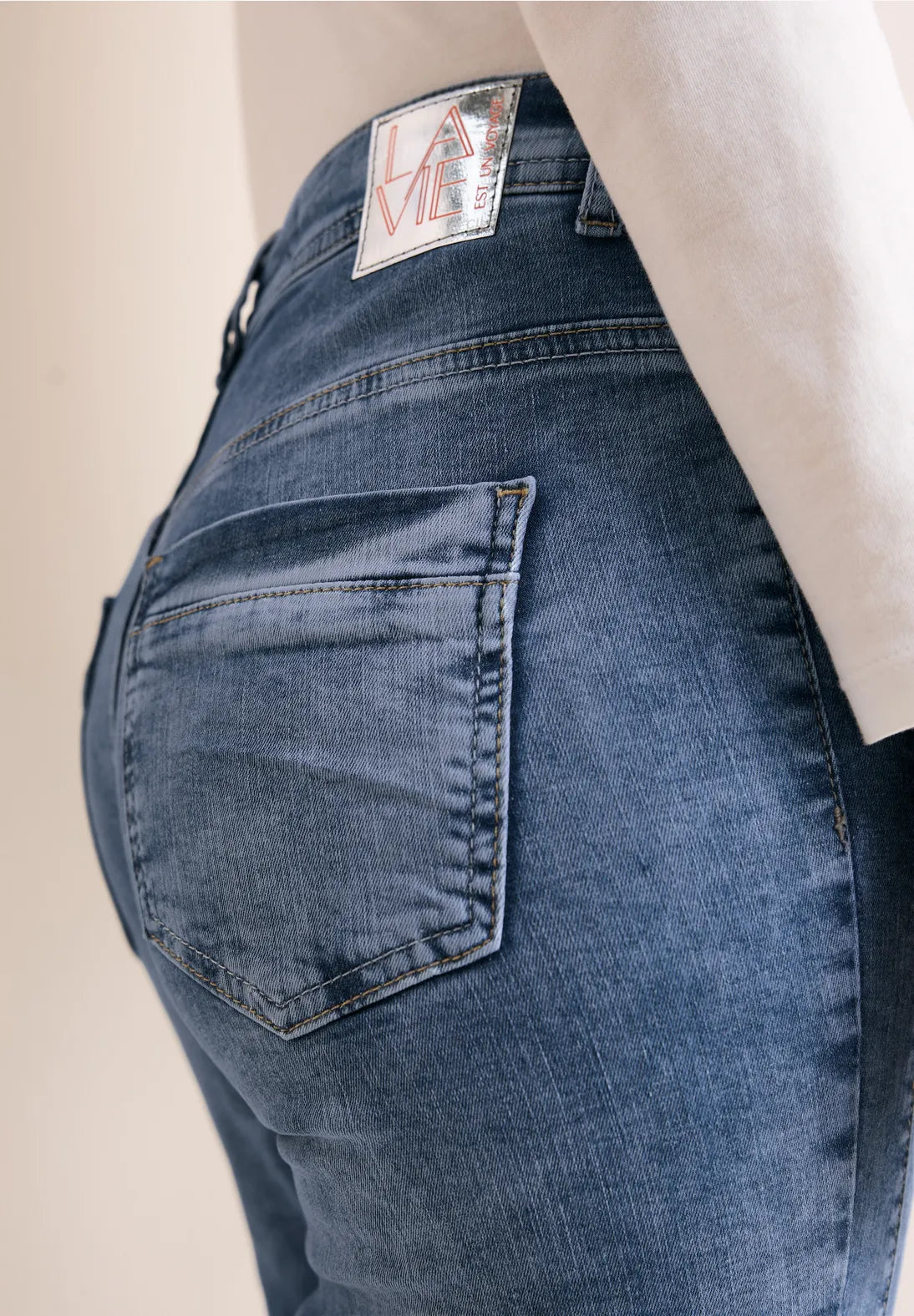 lavado de mezclilla azul claro. El estilo de cinco bolsillos